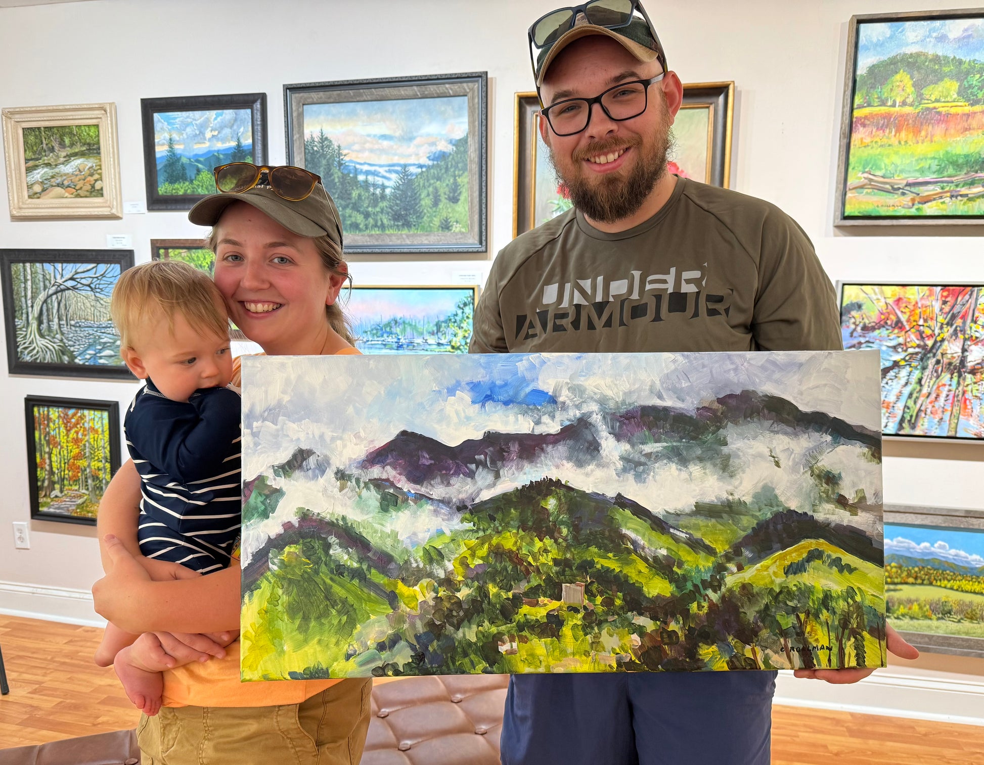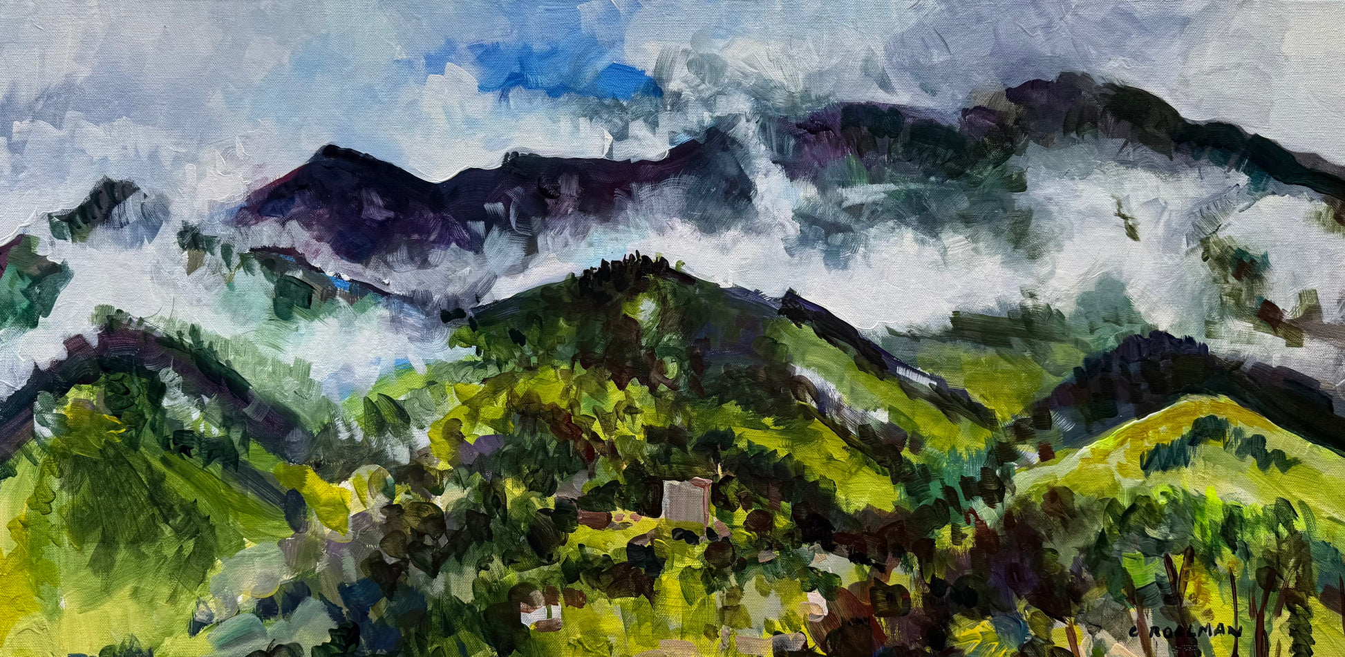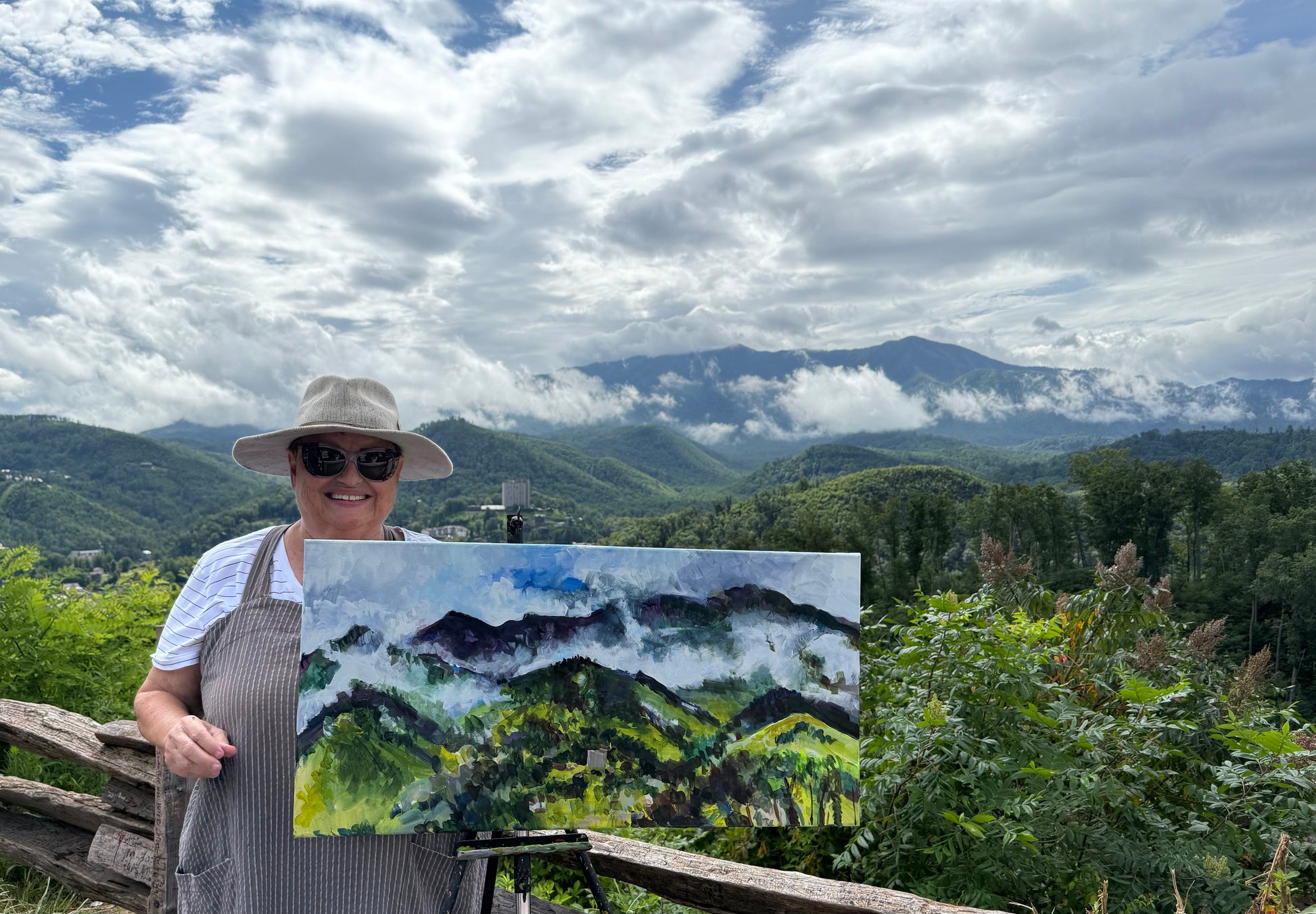 Acrylic Painting - "Uplifting" - This painting surprises me, when I look at it it seems to move. I waited for the clouds to lift from Mount Le Conte and they never did. Right now (Early August 2025) the road to New Found Gap is closed and so lots of people stopped at the Gatlinburg By-Pass while I was painting.