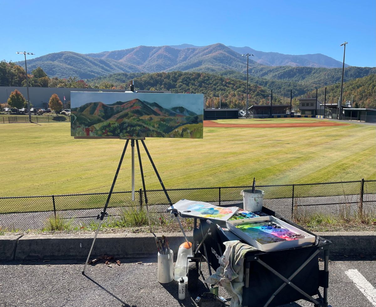Painting - "Anna Porter View" - Acrylic Painting by artist Charlotte Rollman. "The library is behind Pittman Center High School and Event Center and the view from the parking lot is maybe the best point of view in all of Gatlinburg. I tried a new size to crop the buildings down below but the best view is from inside the library out the windows.....maybe they let me come inside when there is snow on Mt LeConte."