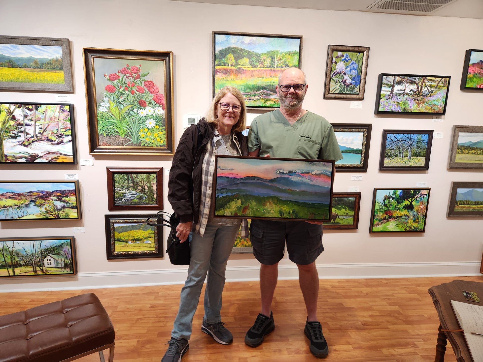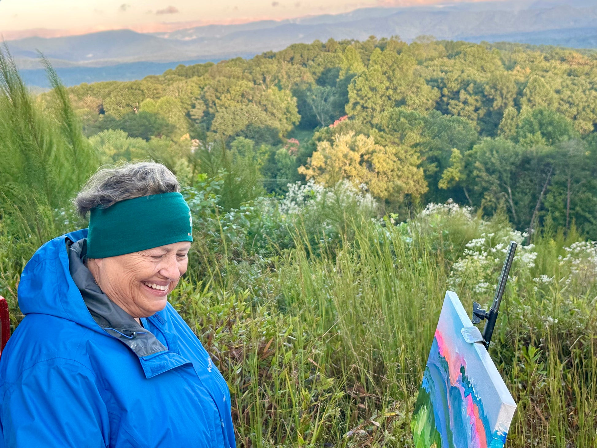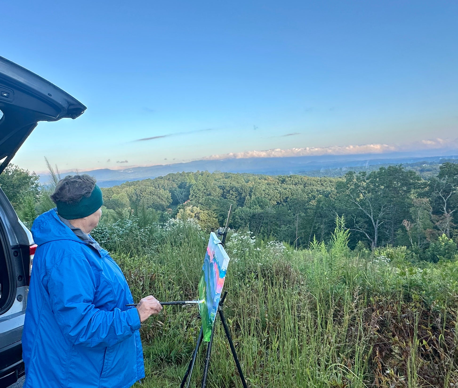 Painting - "Morning Glow" - I got out early this painting morning but sunrise came up behind a house where the residents were asleep and I needed to look the other way. So the glow is the reflected sunrise at Blue Ridge, Georgia. Then my painting buddy, Robin Rohwer, showed up and her painting glowed as well and she took pictures of me painting.