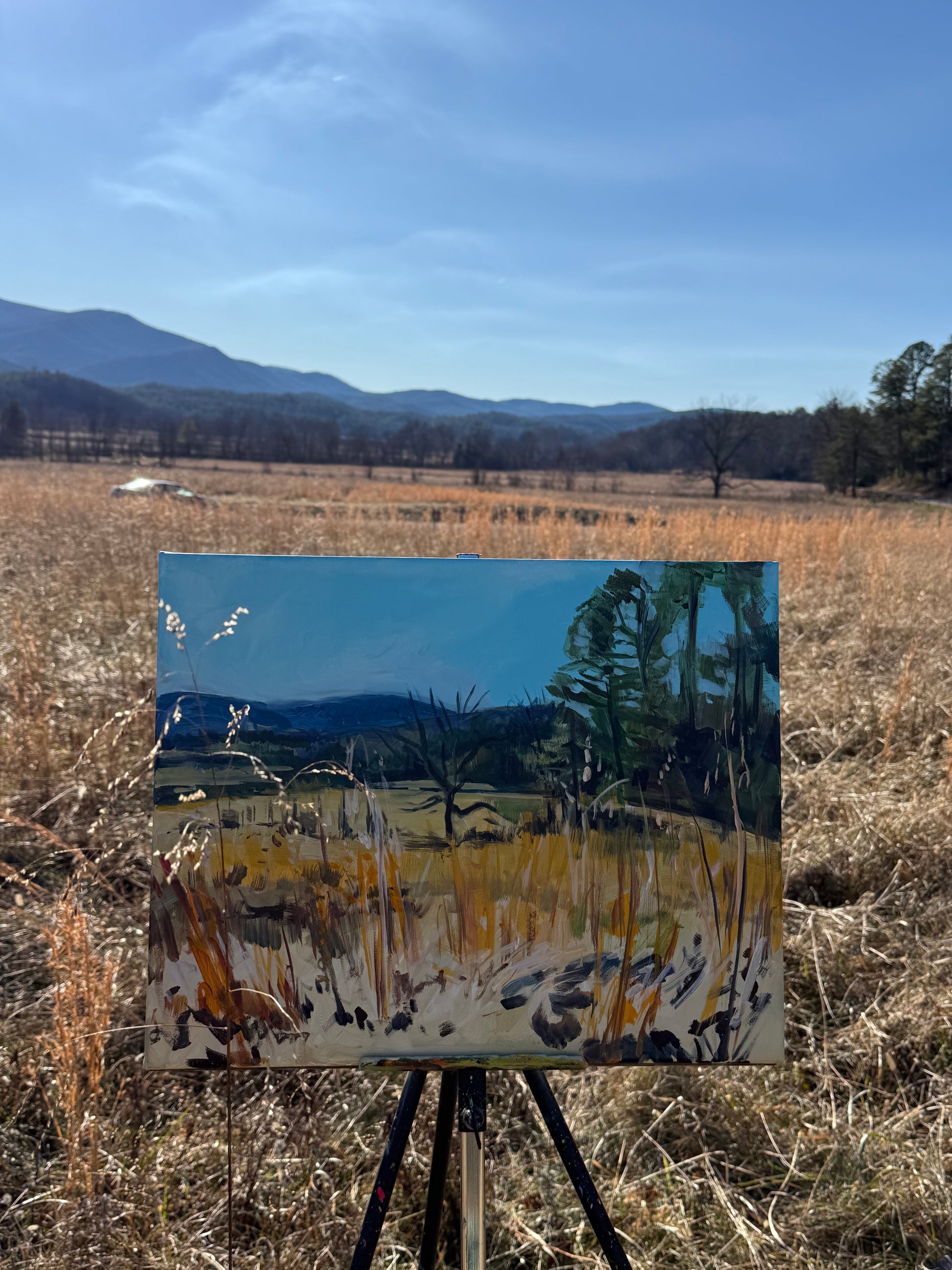 Acrylic Painting - "John Oliver looking at Martha's Branch" - The Oliver Cabin in Cade’s Cove has one of the best views in the Smokies in every season. This was my afternoon painting there on a cold December day. Martha’s Branch Creek is behind the cabin and runs into Abram’s Creek down the hill and another great tree stands at this curve. What could you not love?