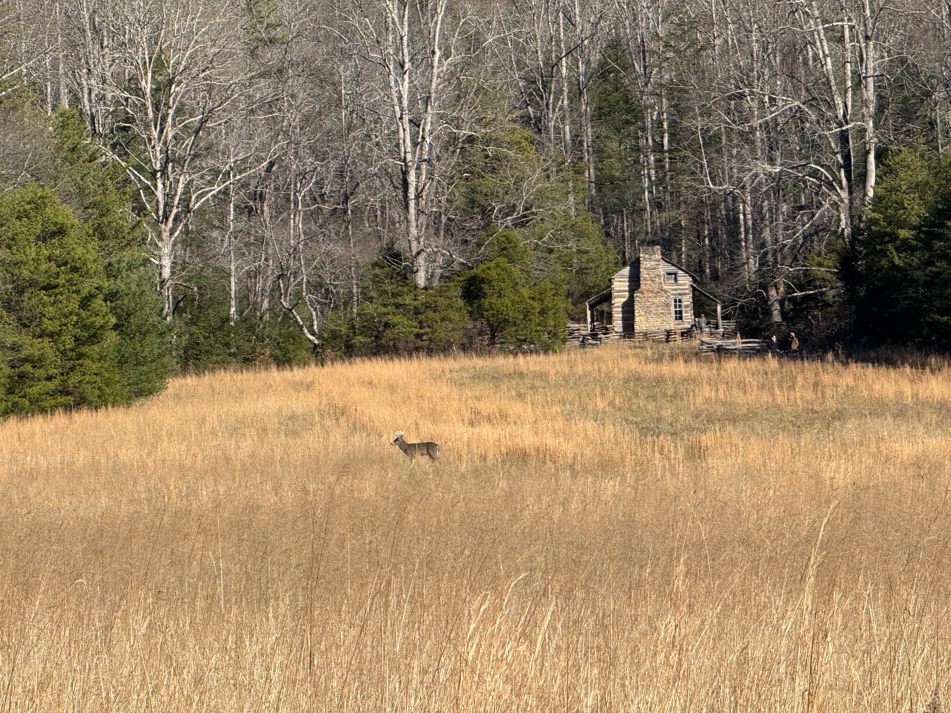 Painting - "Winter at John Oliver's" - Even in winter, there is lots of color in Cade’s Cove. Here the Oliver cabin is so tiny way back in the big grassy field. I stirred a few deer bedding down ahead of me and one of my pictures shows a handsome buck. Maybe I should paint faster.